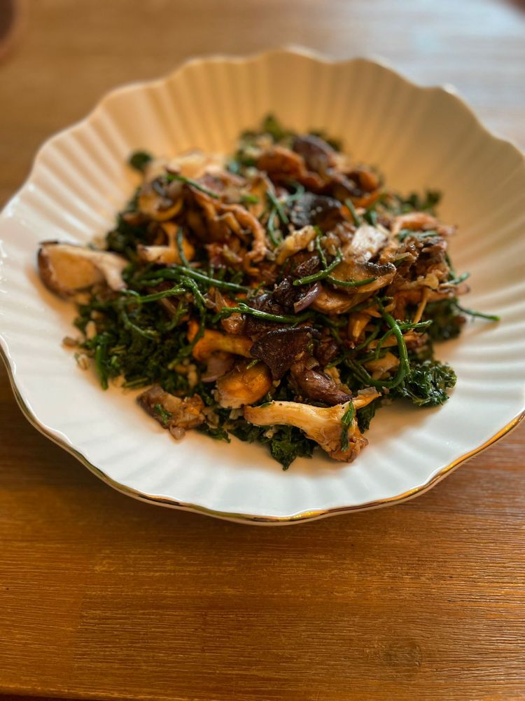 5. Controleer de zeekraal op harde stompjes aan de onderkant van de stengel. Breek deze af. Laat de zeekraal een paar min weken in koud water. Giet af en voeg toe aan de paddenstoelen en roerbak nog 2 min mee.